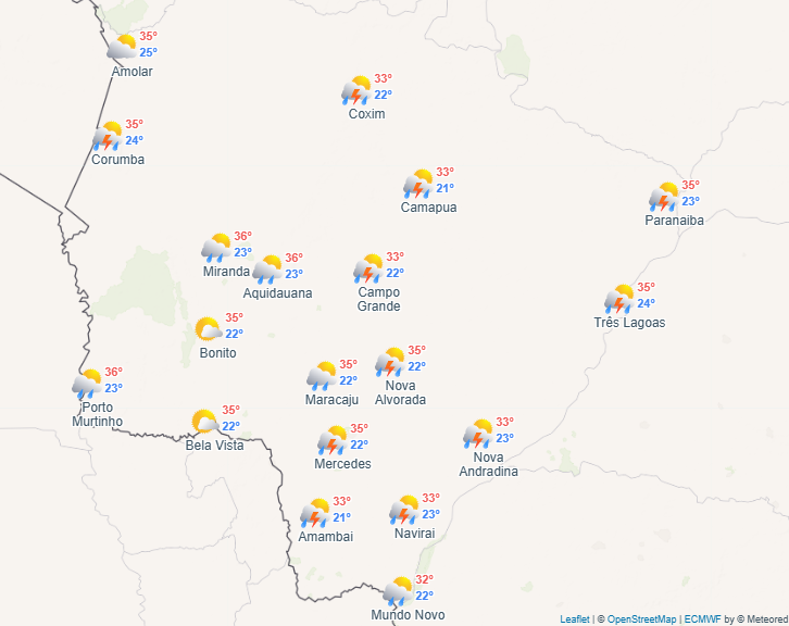 Não chove em áreas do sul e leste de Goiás. Por outro lado, a semana começa com tempo instável em Mato Grosso do Sul e Mato Grosso, com risco de temporais isolados com raios e ventos com intensidade de moderada a forte.