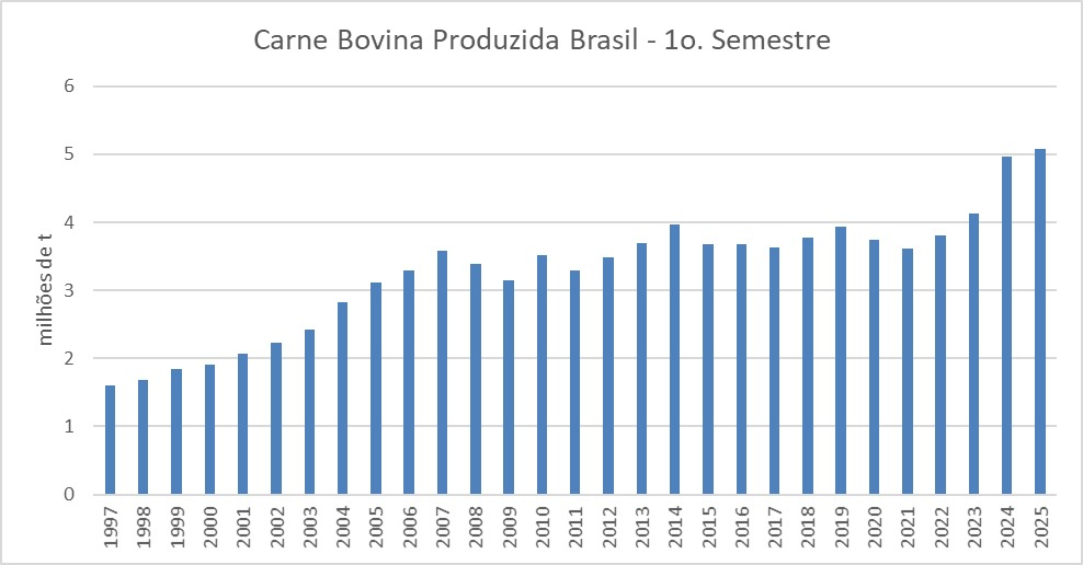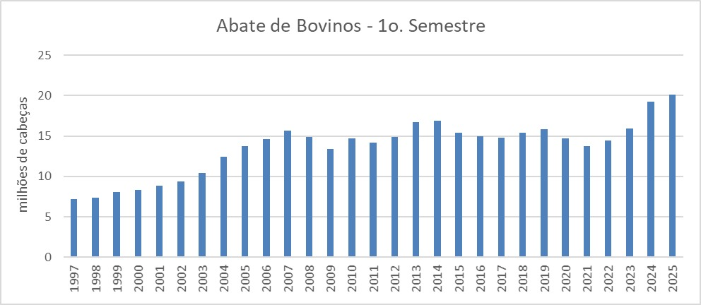 O IBGE divulgou dados preliminares de abate no segundo trimestre/25. O número de animais abatidos foi recorde para um trimestre, 10,4 milhões de cabeças. A produção de carne formal chegou a 2,635 milhões de toneladas no trimestre, tornando recorde o volume nos seis primeiros meses deste ano.