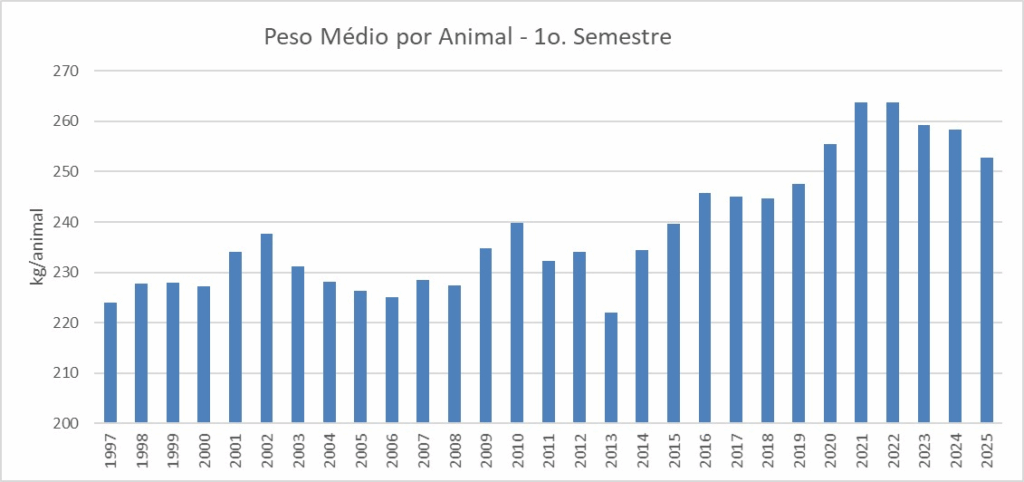 Este é o quarto ano de crescimento seguido do número de animais abatidos e também da produção nacional de carne no 1º semestre. Por outro lado, pelo terceiro ano seguido, o peso médio dos animais abatidos no 1º semestre baixou.