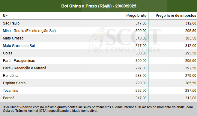 Nesse contexto, todas as 17 regiões monitoradas diariamente pele equipe de analistas da Agrifatto fecharam a semana com preços estáveis para as categorias de boiadas prontas para abate – sem alterações em relação ao dia anterior (quinta-feira, 28/8).