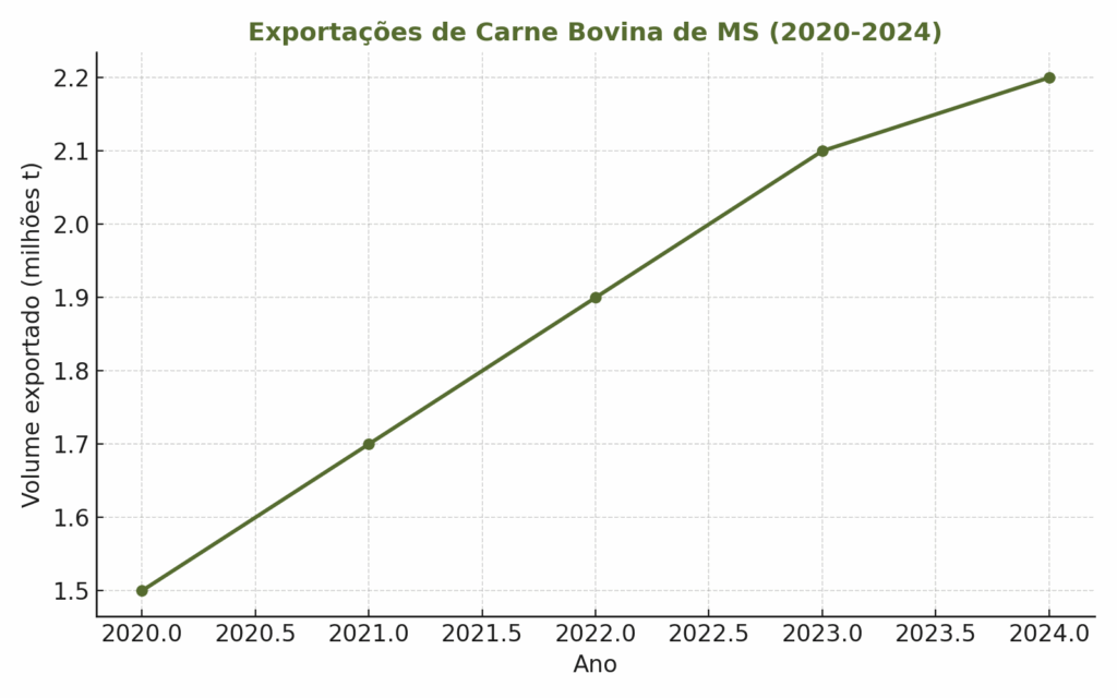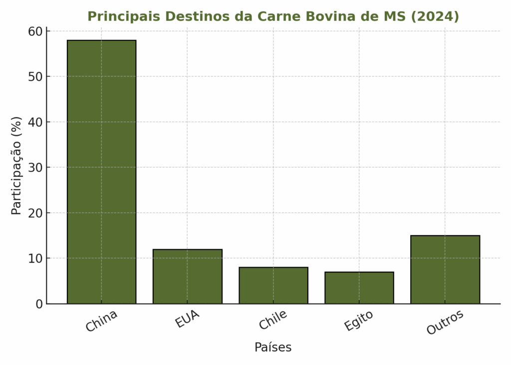 De janeiro a julho de 2025, Mato Grosso do Sul embarcou mais de 2,3 milhões de toneladas de carne bovina, alcançando cerca de US$ 11,5 bilhões em receita, segundo dados da Secretaria de Estado de Meio Ambiente, Desenvolvimento, Ciência, Tecnologia e Inovação (Semadesc). A China segue como principal destino, absorvendo 58% do total, seguida por Estados Unidos (12%), Chile (8%) e Egito (7%).