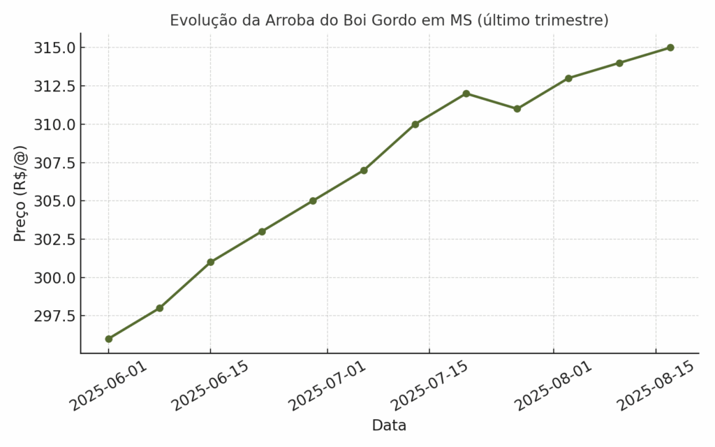 No Mato Grosso do Sul, a arroba do boi gordo tem oscilado de forma moderada no último trimestre, saindo da casa dos R$ 296 em junho para alcançar R$ 315 em meados de agosto. A variação mostra leve recuperação, mas com liquidez reduzida, já que a maioria dos frigoríficos segue operando com escalas previamente contratadas.