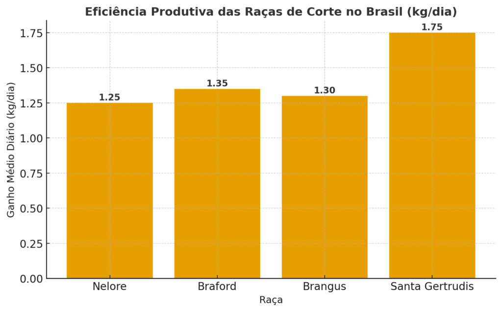 O desempenho da raça chama atenção quando comparado a outras raças taurinas adaptadas. Enquanto o Braford e o Brangus registram ganhos médios diários entre 1,2 e 1,4 kg/dia em provas similares, o Santa Gertrudis alcançou 1,75 kg/dia nesta edição — um avanço que reforça sua competitividade em cruzamentos industriais e programas de melhoramento genético.