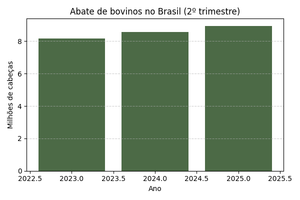 Segundo o IBGE (Pesquisa Trimestral do Abate de Animais), o Brasil abateu 8,94 milhões de cabeças de bovinos no segundo trimestre de 2025, um aumento de 9,7% em relação ao mesmo período do ano anterior — o maior volume desde 2019.