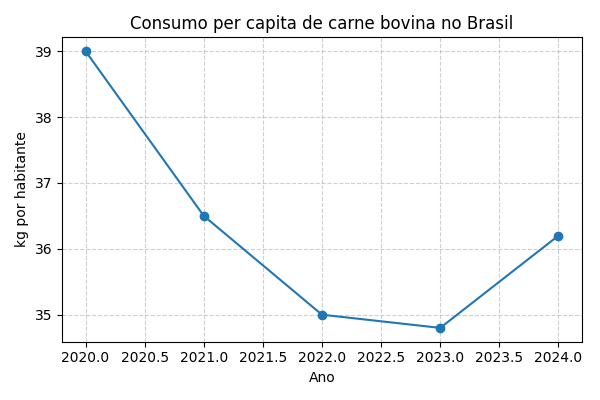 De acordo com o último balanço da ABIEC (Associação Brasileira das Indústrias Exportadoras de Carne), o consumo per capita de carne bovina no Brasil atingiu 36,2 kg por habitante em 2024, após dois anos de queda. O número ainda está abaixo da média histórica (de cerca de 40 kg), mas indica uma recuperação impulsionada pela melhora no poder de compra e estabilidade nos preços do varejo.