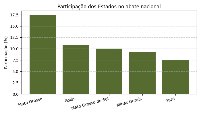 Em Mato Grosso do Sul, o último levantamento do MAPA e da FAMASUL mostra que o estado é o terceiro maior produtor de carne bovina do país, com cerca de 10% do abate nacional, atrás apenas de Mato Grosso e Goiás.