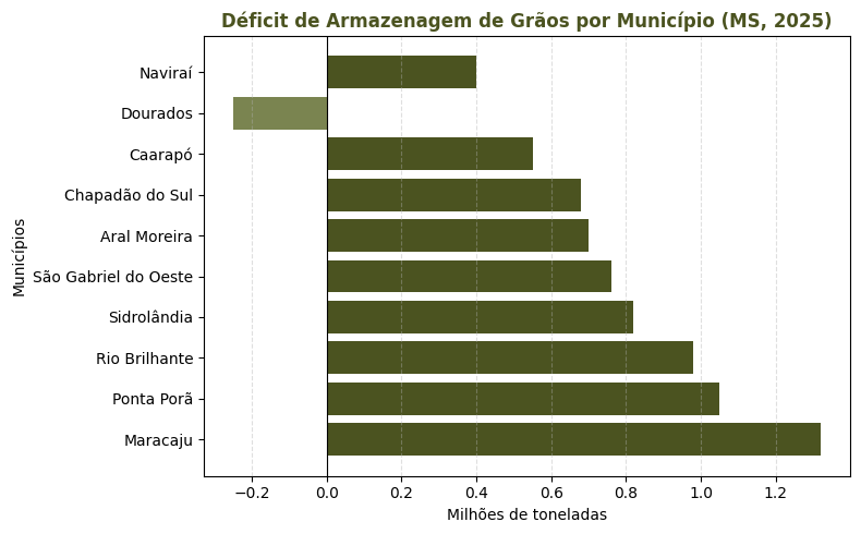 O levantamento mostra que 73 dos 78 municípios analisados apresentam déficit de armazenagem. A situação é crítica em regiões de alta produtividade como Maracaju, Ponta Porã, Rio Brilhante, Aral Moreira e São Gabriel do Oeste.