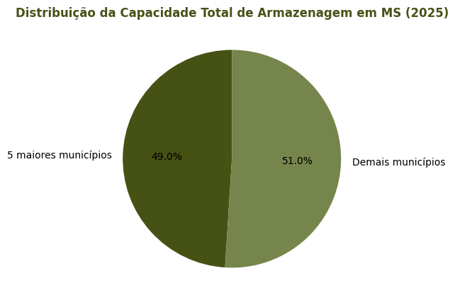 Os cinco maiores municípios concentram 49% da capacidade total de armazenagem, mas apenas 38% da produção estadual, o que evidencia a desigualdade regional na infraestrutura.