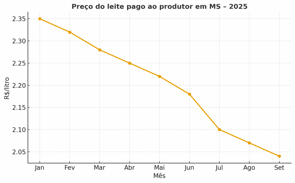 De acordo com dados do Centro de Estudos Avançados em Economia Aplicada (Cepea/Esalq-USP), o preço médio do litro de leite pago ao produtor sul-mato-grossense caiu de R$ 2,38 em julho para R$ 2,04 em setembro de 2025, o menor valor real desde 2020. O montante não cobre os custos de produção, que, segundo levantamento da Famasul (Federação da Agricultura e Pecuária de MS), giram em torno de R$ 2,60 por litro, considerando alimentação, energia elétrica e mão de obra.