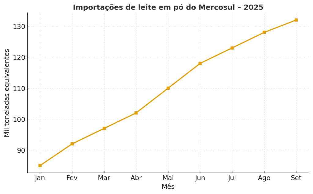 Dados do Comex Stat, do Ministério do Desenvolvimento, Indústria e Comércio, mostram que as importações de leite em pó cresceram 36% entre janeiro e setembro de 2025 em comparação com o mesmo período do ano passado. O principal fornecedor continua sendo o Uruguai, seguido da Argentina, ambos membros do Mercosul.
