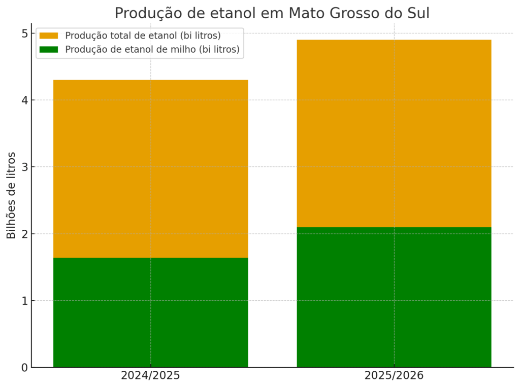 Na safra 2024/2025, três usinas — Inpasa Dourados, Inpasa Sidrolândia e Neomille CerradinhoBio, em Maracaju — foram responsáveis por 38,1% dos 4,3 bilhões de litros de etanol produzidos no estado. Segundo a Conab, a projeção para a próxima safra (2025/2026) é de 4,9 bilhões de litros, sendo 42,8% oriundos do milho, confirmando o ritmo acelerado de crescimento da bioenergia no estado.