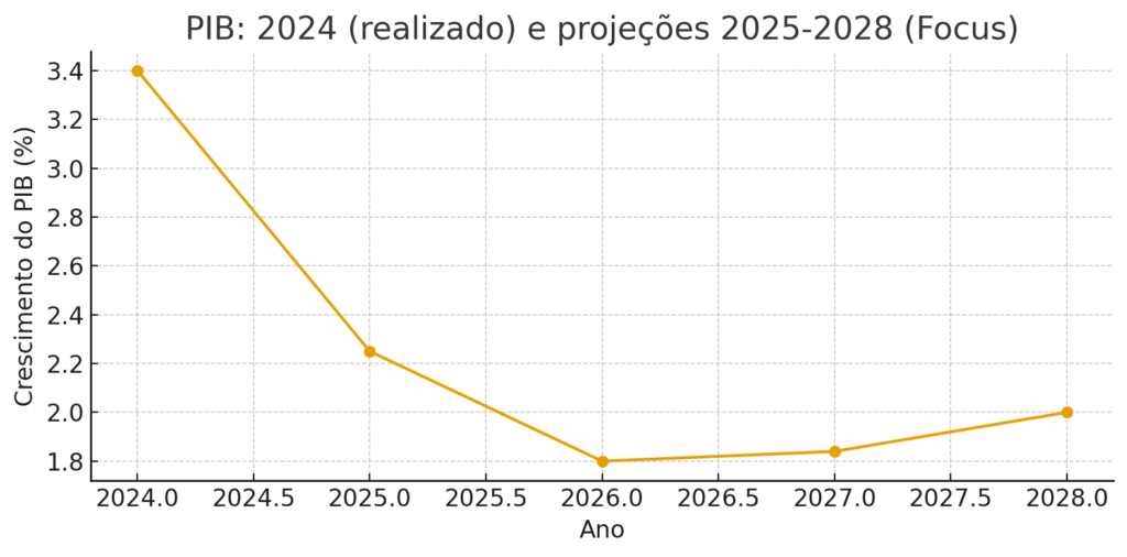O mercado financeiro projeta agora um crescimento de 2,25% para 2025 e expectativas de 1,8% para 2026, 1,84% para 2027 e 2,0% para 2028 (dados do Boletim Focus, conforme o release). Esses números convergem para um cenário de crescimento mais lento do que em 2024, mas suficiente para manter um círculo virtuoso de produção em segmentos com maior competitividade internacional — entre eles, o agro.
