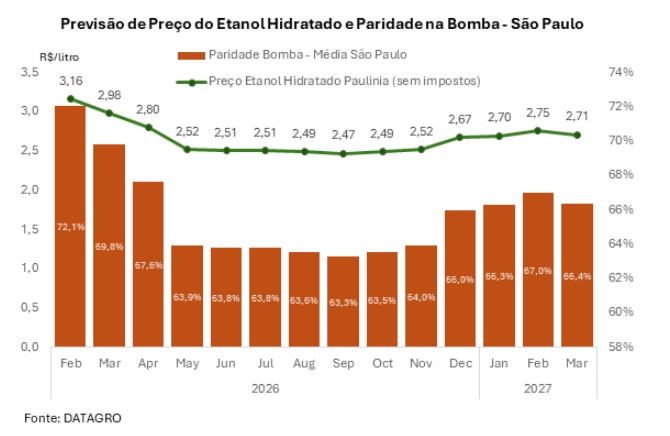 Como consequência, a razão entre os preços do etanol hidratado e da gasolina na bomba no estado de São Paulo deverá permanecer mais favorável ao etanol ao longo de toda a safra 26/27.