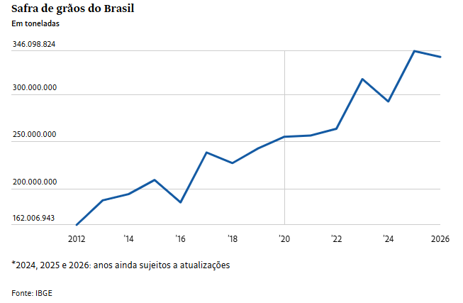 Conforme o órgão, a produção saltou de 162 milhões de toneladas em 2012 para o patamar recorde de 346,1 milhões de toneladas em 2025.