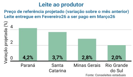 As sinalizações do Conseleite para o leite entregue em fevereiro e a ser pago em março de 2026 indicam valorização do preço ao produtor em todos os estados acompanhados. O resultado reforça a melhora das perspectivas para o setor neste início de ano, em contraste com os movimentos de queda observados nos meses anteriores. De forma geral, as projeções apontam continuidade da recuperação no pagamento ao produtor.