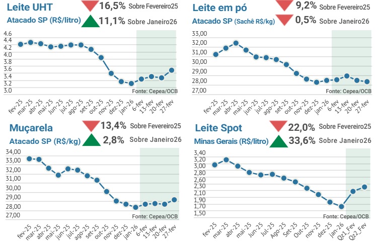 Os preços de leite e derivados seguiram em recuperação ao longo de fevereiro de 2026. O mercado de leite spot registrou forte alta nas duas quinzenas do mês, refletindo menor oferta de leite cru e a aproximação da entressafra. No atacado, o leite UHT e a muçarela também avançaram frente a janeiro, reforçando o movimento de reação dos preços. O leite em pó apresentou oscilações ao longo do mês, mas terminou fevereiro praticamente estável em relação ao mês anterior.