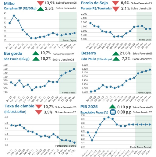 Em fevereiro de 2026, o mercado pecuário apresentou forte valorização nos preços. A alta na arroba do boi foi sustentada pela oferta limitada de animais para abate e demanda firme, com boas exportações. No mercado de reposição, os preços do bezerro seguiram a alta, já indicando a menor disponibilidade. O milho registrou leve alta em fevereiro em um contexto de atraso no plantio da safrinha e possibilidade de piora na produtividade das lavouras. Já o farelo de soja apresentou oscilações ao longo do mês e encerrou fevereiro com leve recuo frente a janeiro. No cenário macroeconômico, o câmbio recuou ao longo de fevereiro, indicando apreciação do real frente ao dólar, enquanto as expectativas para o PIB de 2026 permaneceram em torno de 1,8%.